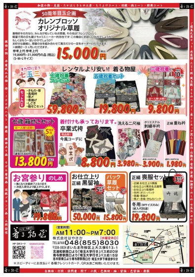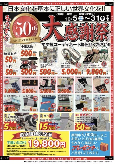 おかげさまで、もうすぐ50周年を迎えることになりました。日頃のご愛顧に感謝を込めて50にちなんだ商品をご用意いたしました。☆振袖、卒業式向け髪飾り 500円~☆振袖用飾り付き帯締め 5,000円(通常15,900円の品)限定10本☆お仕立て上がり正絹振袖、帯、帯締め、帯揚げ、仕立て上がり洗える襦袢の5点セットがなんと59,800円(税込) モデル着用品になります。メンテナンス済。限定5点☆ママ振袖の方に朗報!!振袖の帯だけ新調したい方向け 正絹で5,000円(税込) もちろん小物合わせ、コーディネートもお任せください。 2025年成人式にも着る物屋なら間に合う、お仕立て上がり品も多数取り揃えております。 ☆初釜向け訪問着、附下、色無地も豊富に取り揃えております。 お仕立て代が安いこの機会をお見逃しなく!!是非お気軽に覗きにいらしてください。皆様のご来店を心よりお待ち申し上げております。